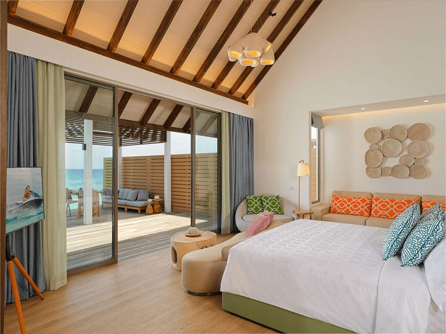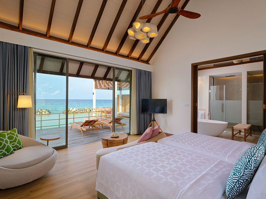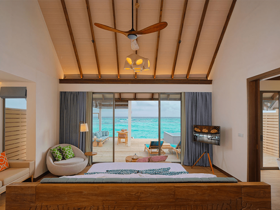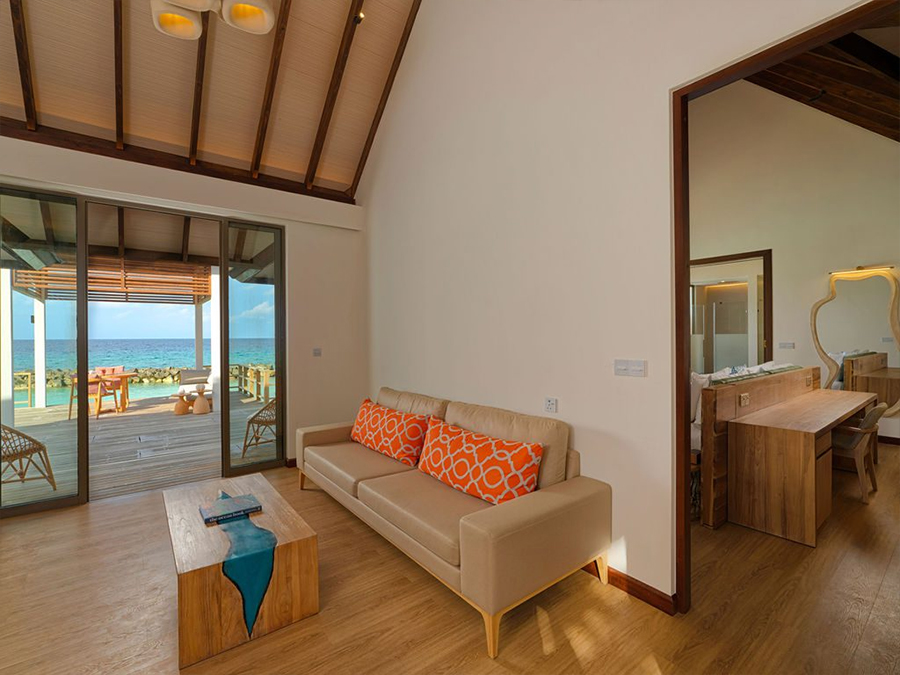 房型介绍:这间带滑梯的水上总统套房是终极水上奢华之选,设有四间卧室、大型健身泳池和私人海洋滑梯。总统套房拥有宽敞的起居区和壮丽的海景,非常适合大型团体或在马尔代夫寻求无与伦比的体验。