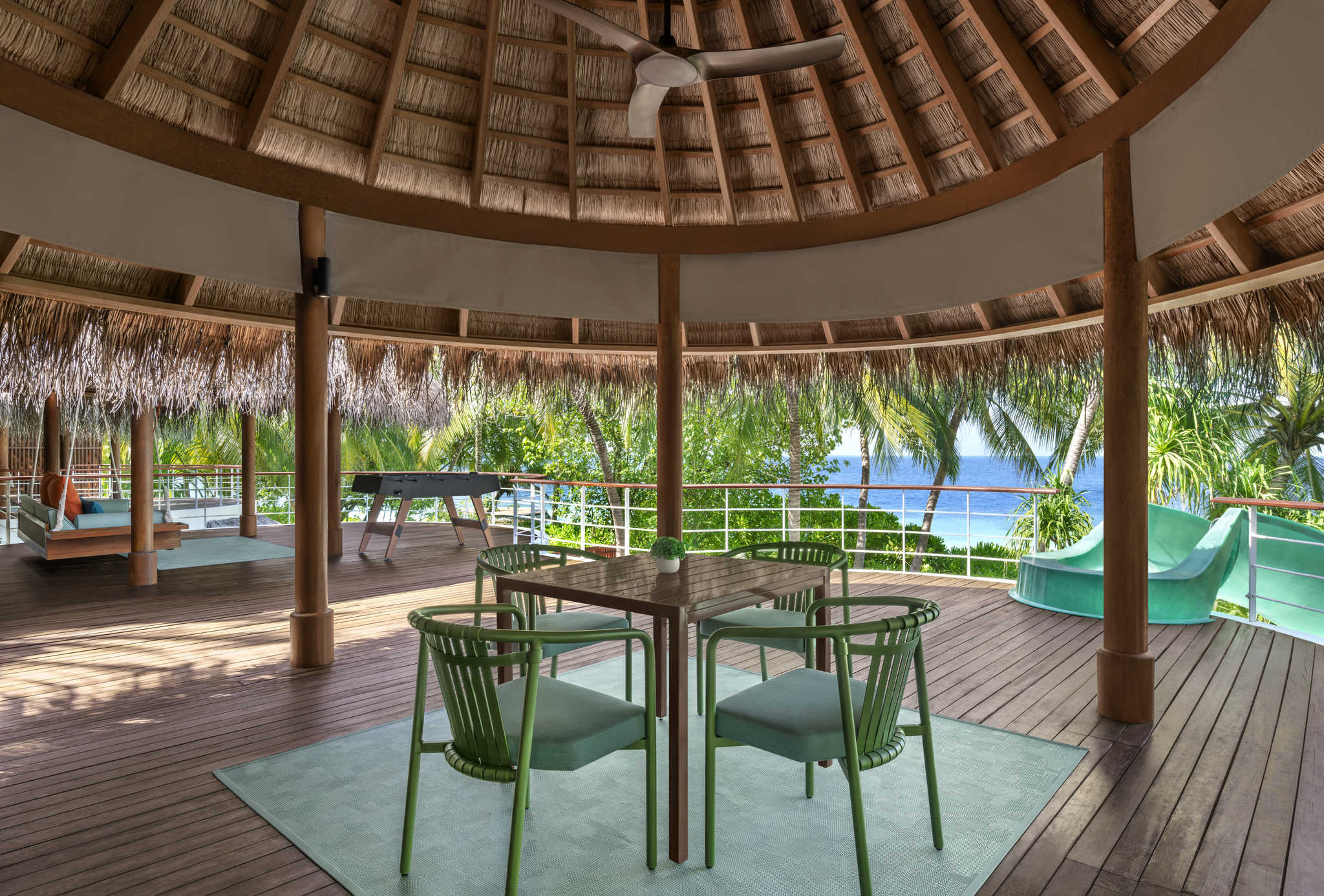 这里可以提供如马尔代夫金枪鱼汤、椰子水、玫瑰水、牛奶和新鲜果汁等饮料。在酒吧停下来喝一杯精心制作的鸡尾酒,或者在我们船形的桌子旁举办一次聚会。