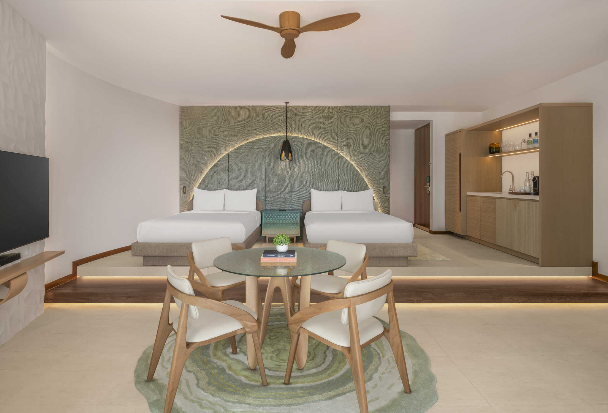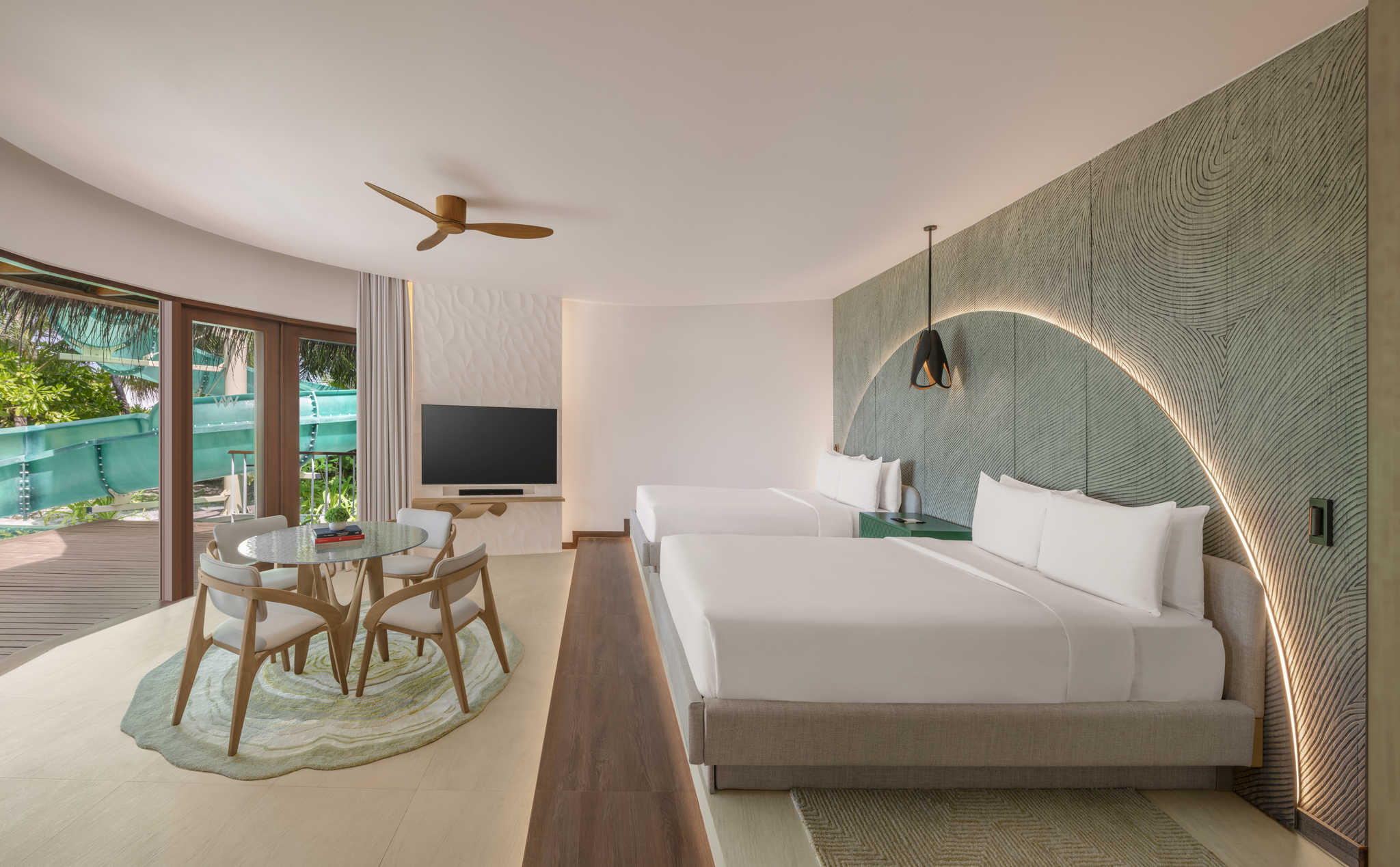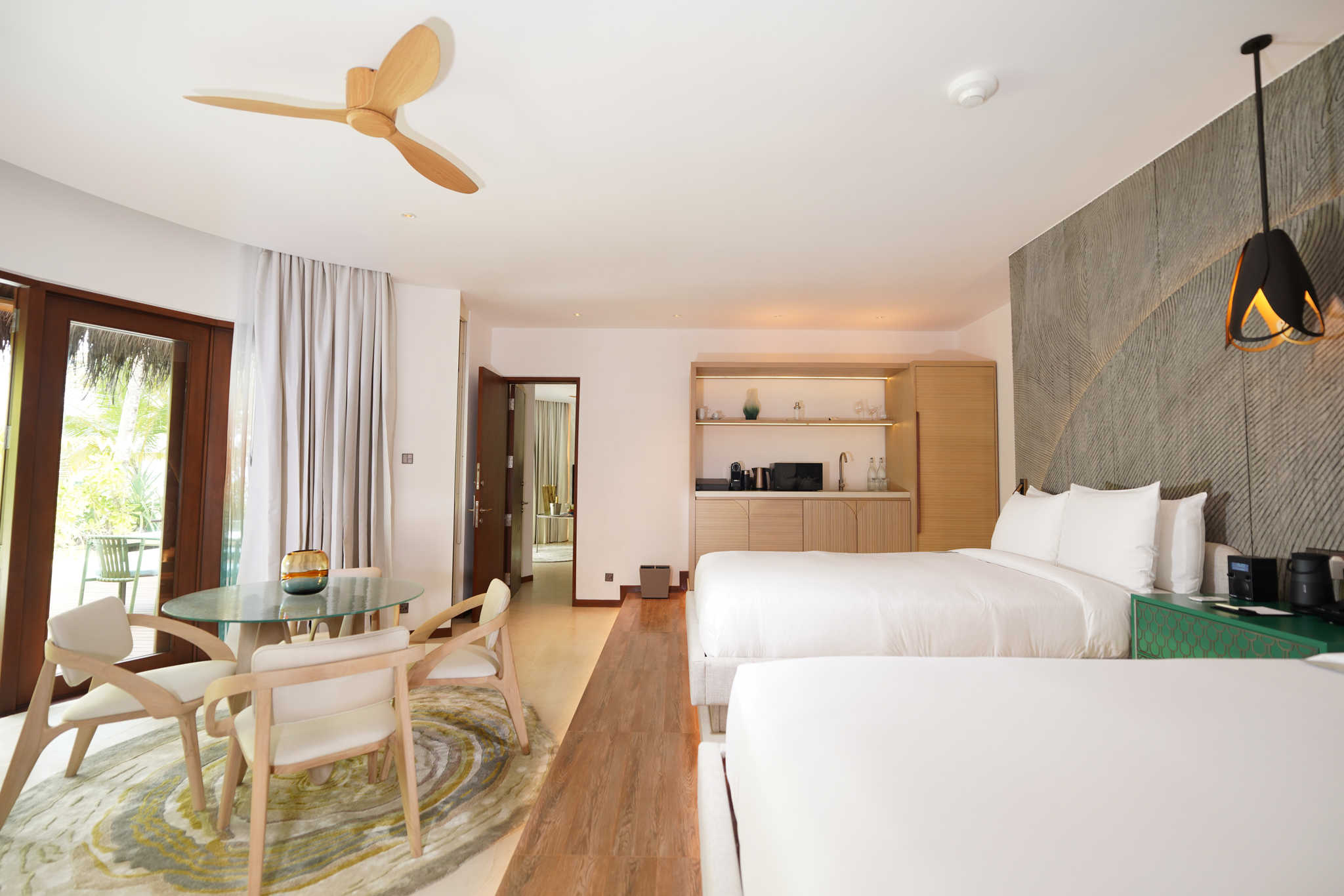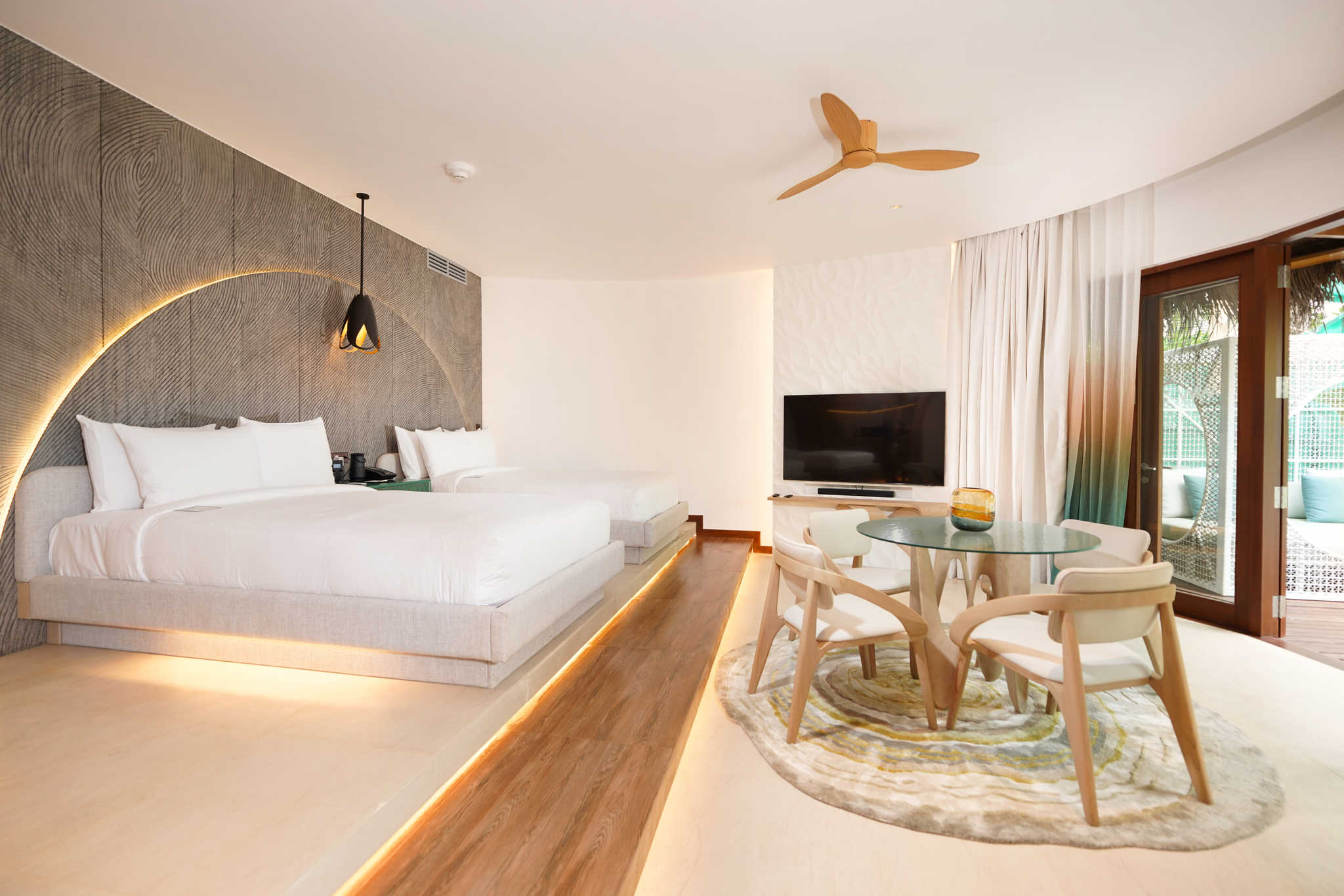 房型介绍:双卧室房型总共只有3间,并且位置绝佳,位于水屋的最顶端。面积达到了323平米,最多可以入住6个大人或者4大2小,非常适合朋友结伴以及家庭度假出行。