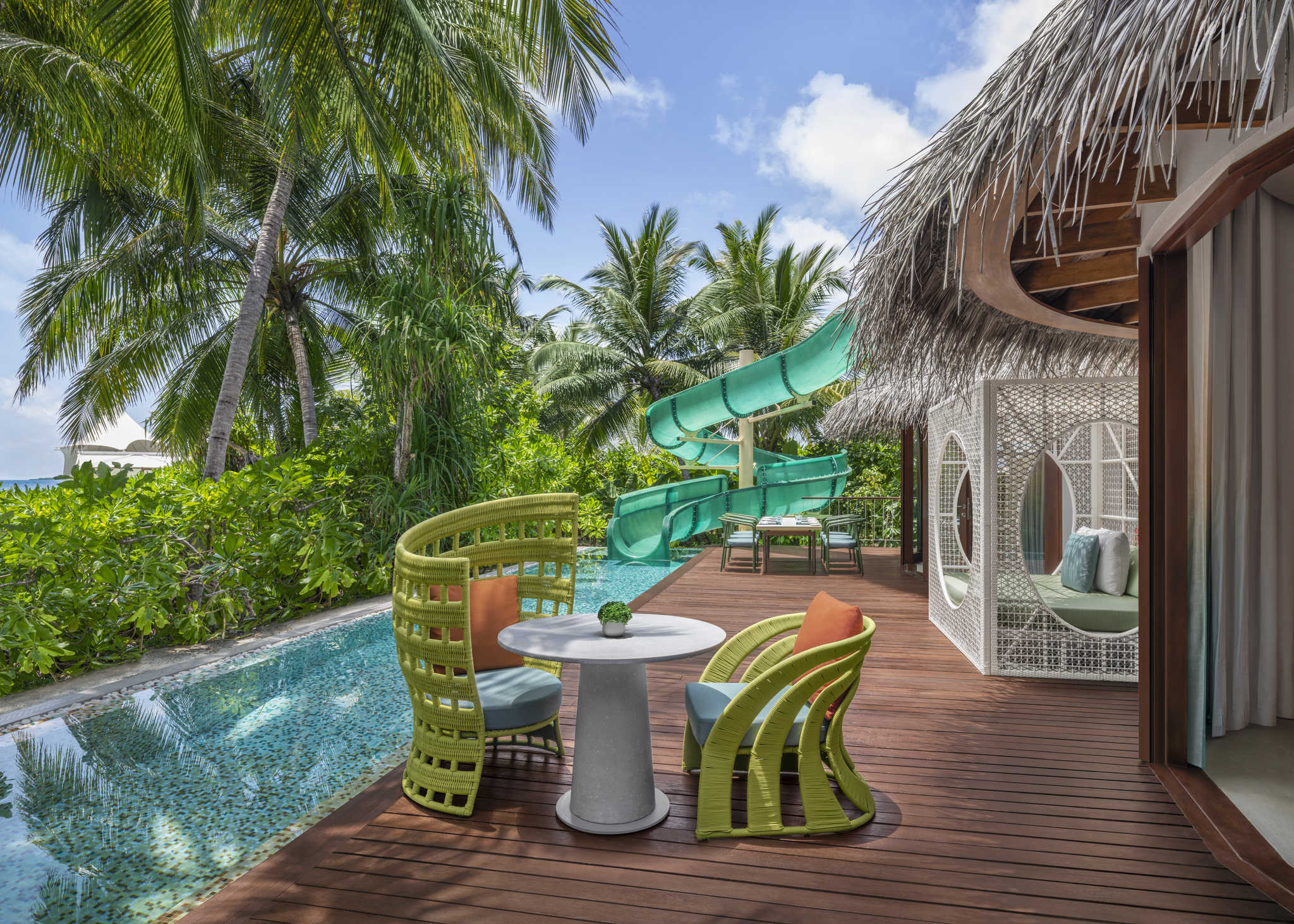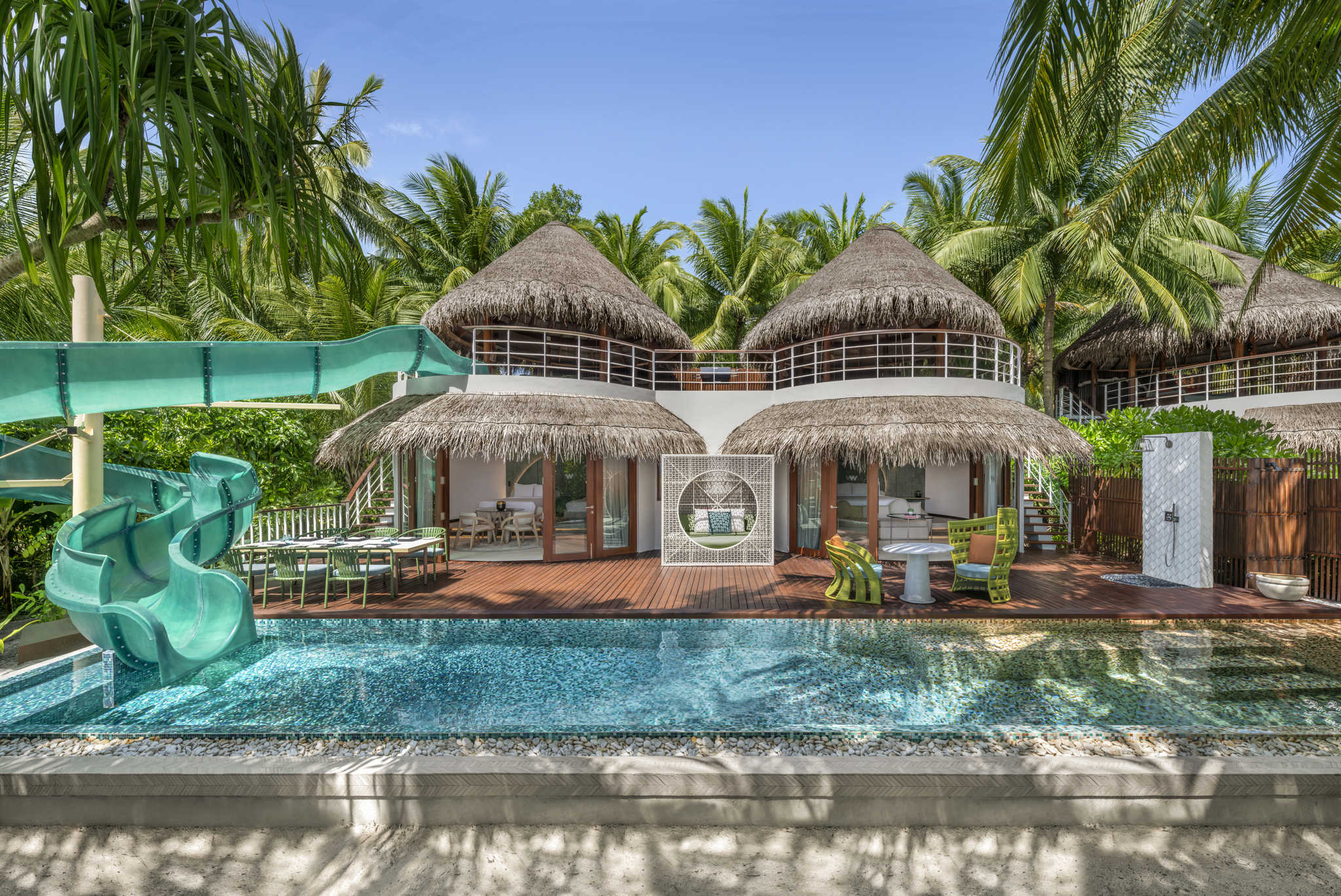 别墅有带按摩池座椅的超大无边泳池、环绕式阳光露台、大型主套房和和可欣赏印度洋全景的精致套房,这一切营造了一个极其放松、豪华的娱乐平台。