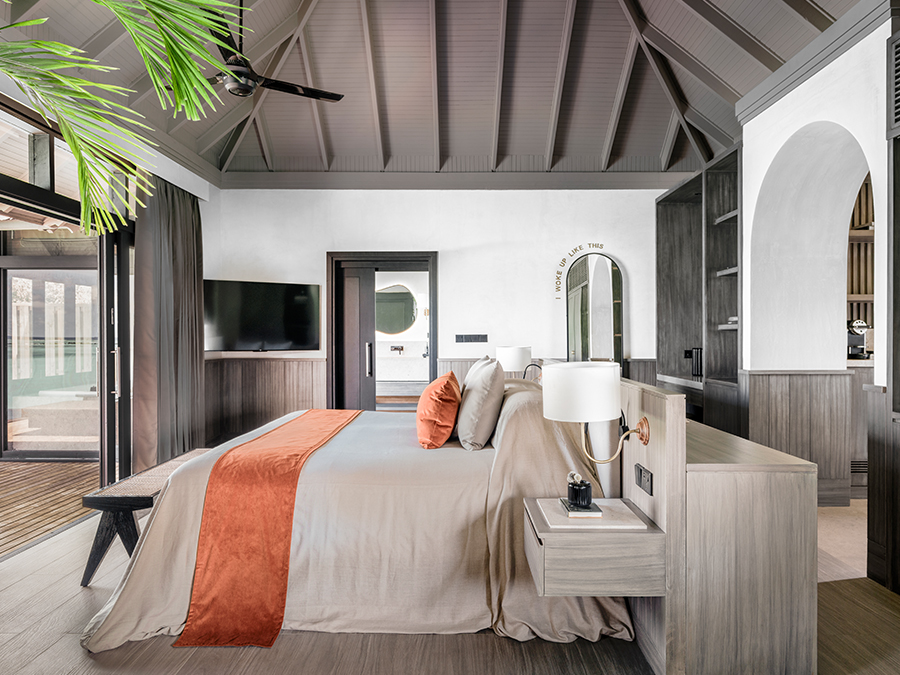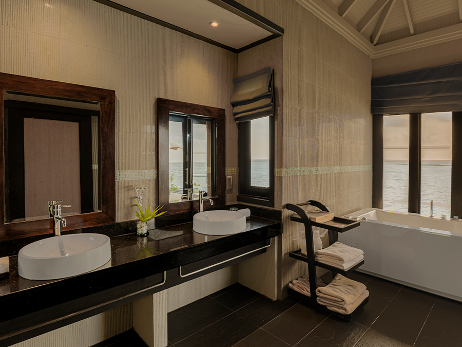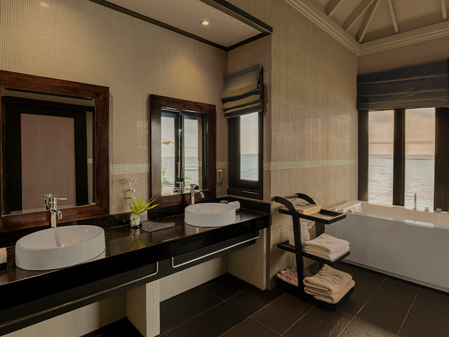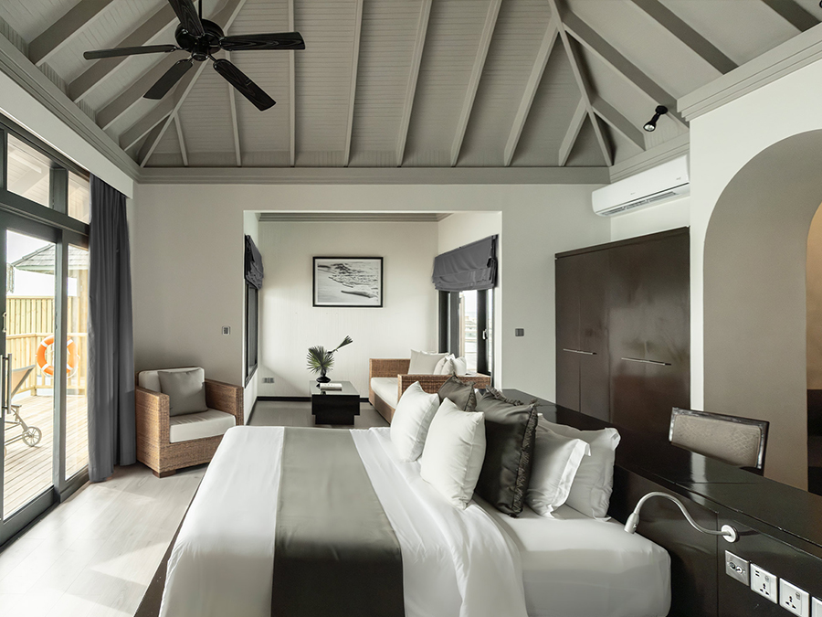 房型介绍:这是终极VIP,以及社会名流们最爱的居所,也是岛上最大的别墅,最多可容纳10位客人。专职管家7*24小时随时待命,无论有什么要求,都能提供无懈可击的服务。它有两层楼,拥有三间特大号卧室、一间休息室和台球室、小厨房和水疗室。在户外还有一个餐厅、阳光甲板和大型游泳池,另外还拥有一大片私人海滩。