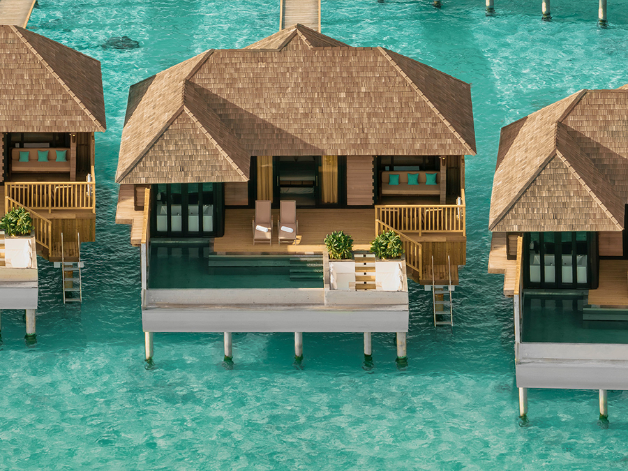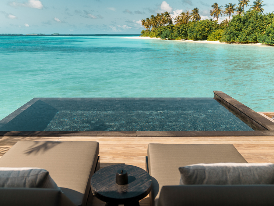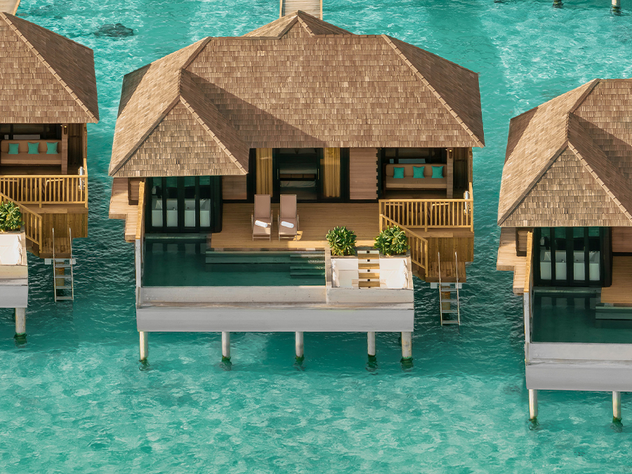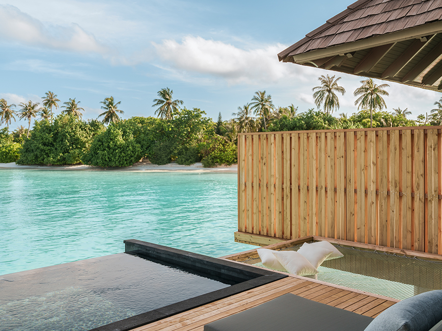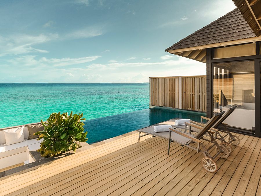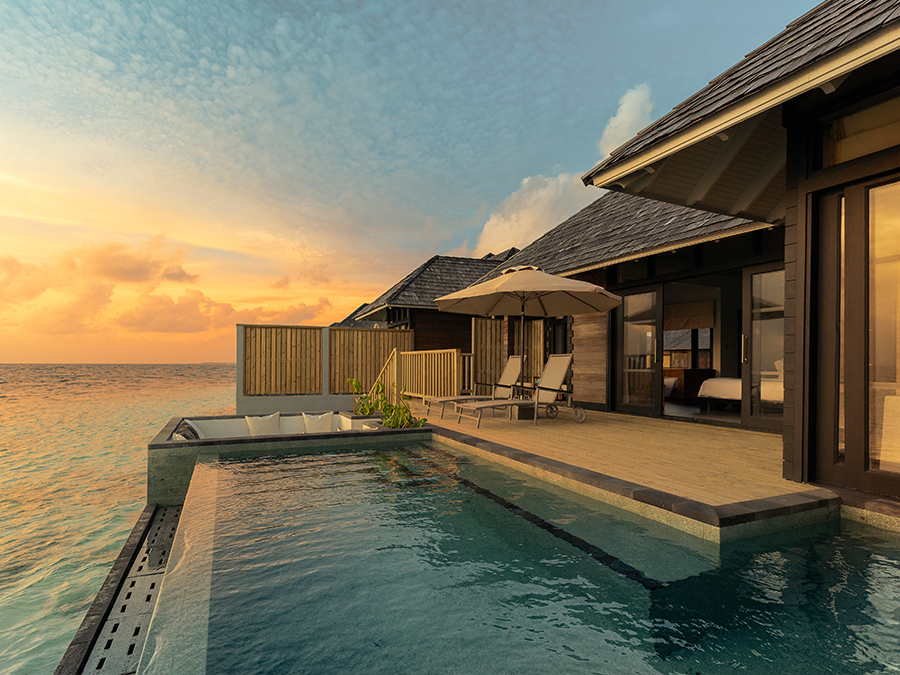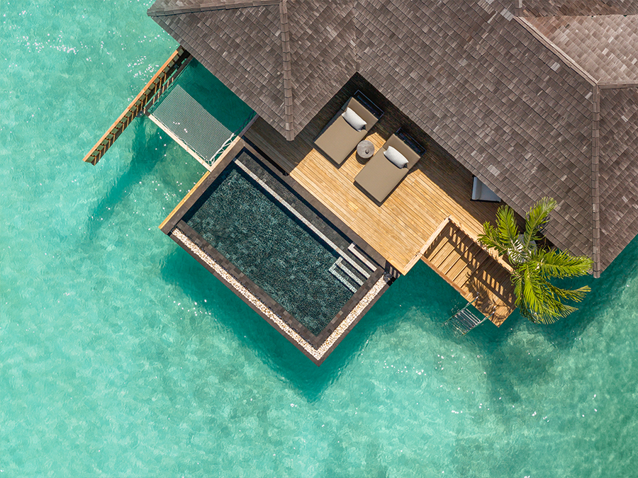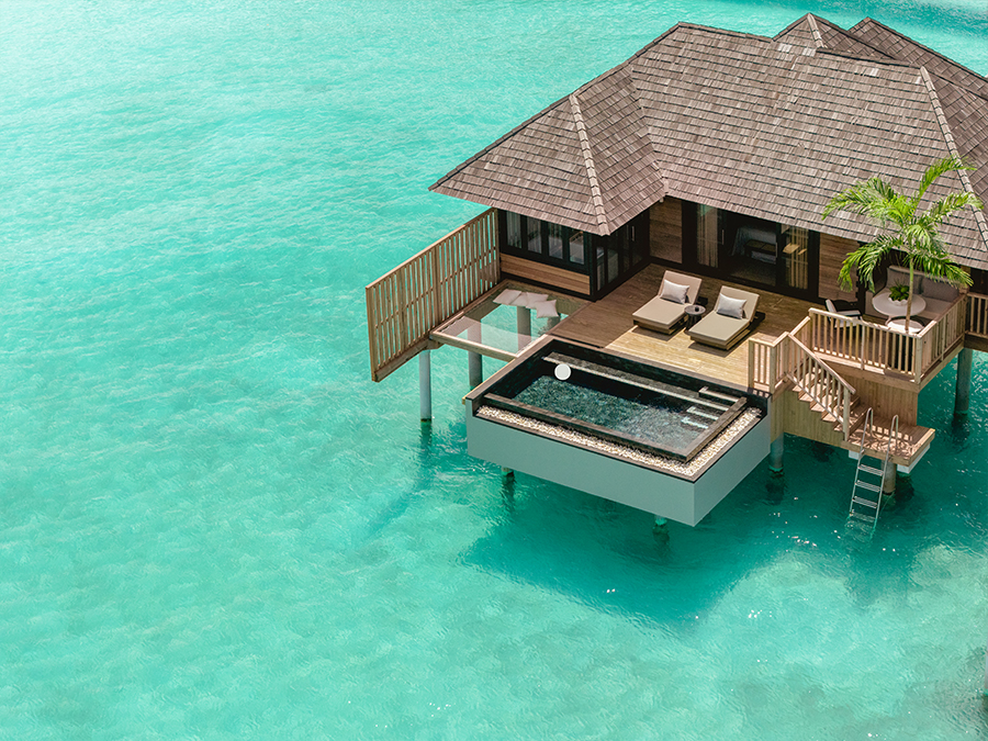 房型介绍:地平线水上泳池别墅总共有10间,房间面积129平米,地平线水上泳池别墅比地平线水上别墅多了一个私人泳池,是情侣或家庭的完美选择,配有玻璃观景地板、宽敞的生活空间,可以完美地欣赏到无尽的海景,海景无限延伸到地平线。房间最多可以入住3名成人1名小孩或2名成人2名小孩。