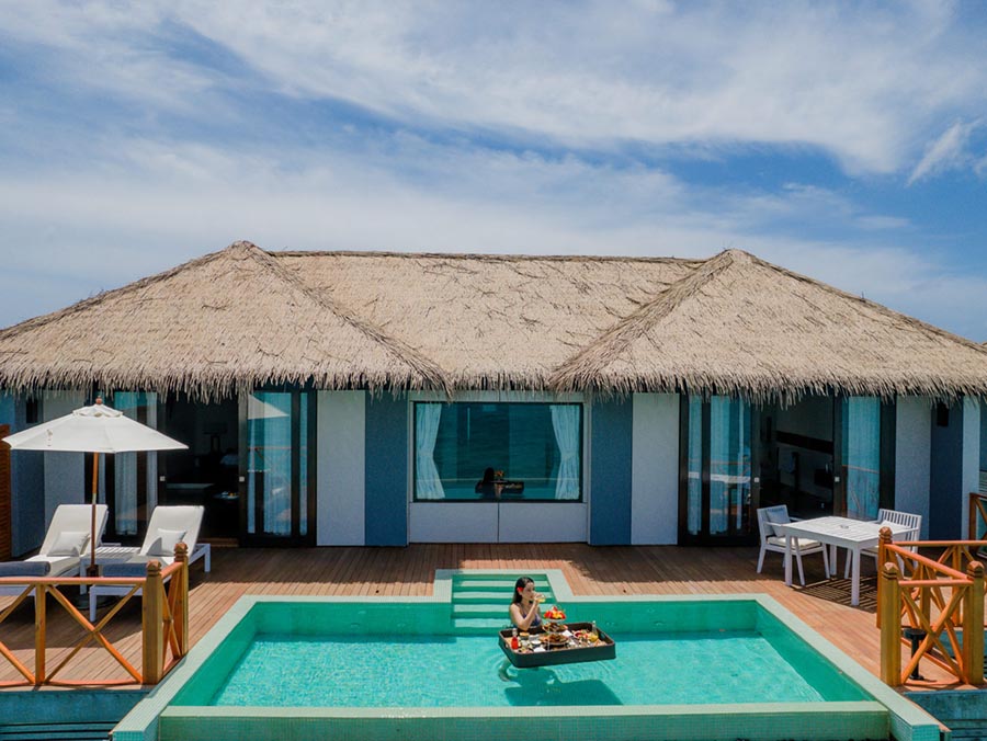 房型介绍:水上泳池别墅总共只有10间,房间面积190平米,别墅配有一个宽敞的日光浴甲板和一个私人泳池,房间最多可以入住3名成人或者2名成人和2名小孩。