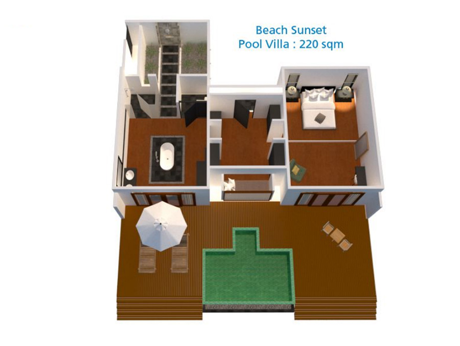 房型介绍:沙滩泳池别墅总共有4间,每间的面积220平米,别墅备有一个私人泳池、户外雨式淋浴、室内淋浴和浴缸。该房型最多可以入住3名成人或者2名成人和2名小孩。