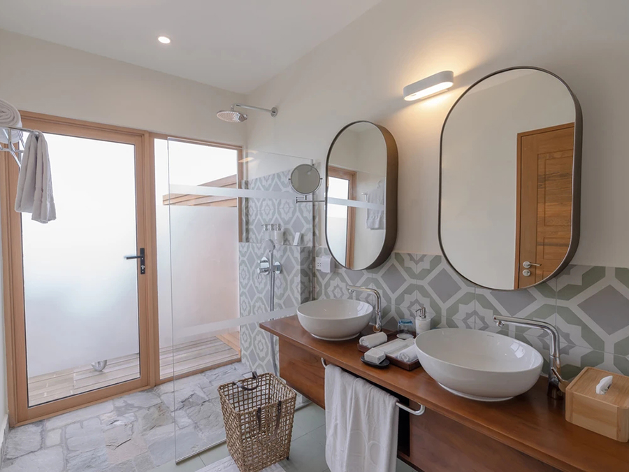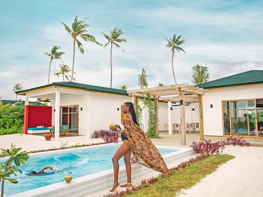 房型介绍:位于海滩别墅的对面,可以欣赏到令人惊叹的日落美景。总共有20间,面积70㎡,不带私人泳池,提供更大的客厅和浴室,提供更多的空间。每间海滩套房均设有一间典型的马尔代夫露天浴室。最多可以入住3名成人+1名小孩。