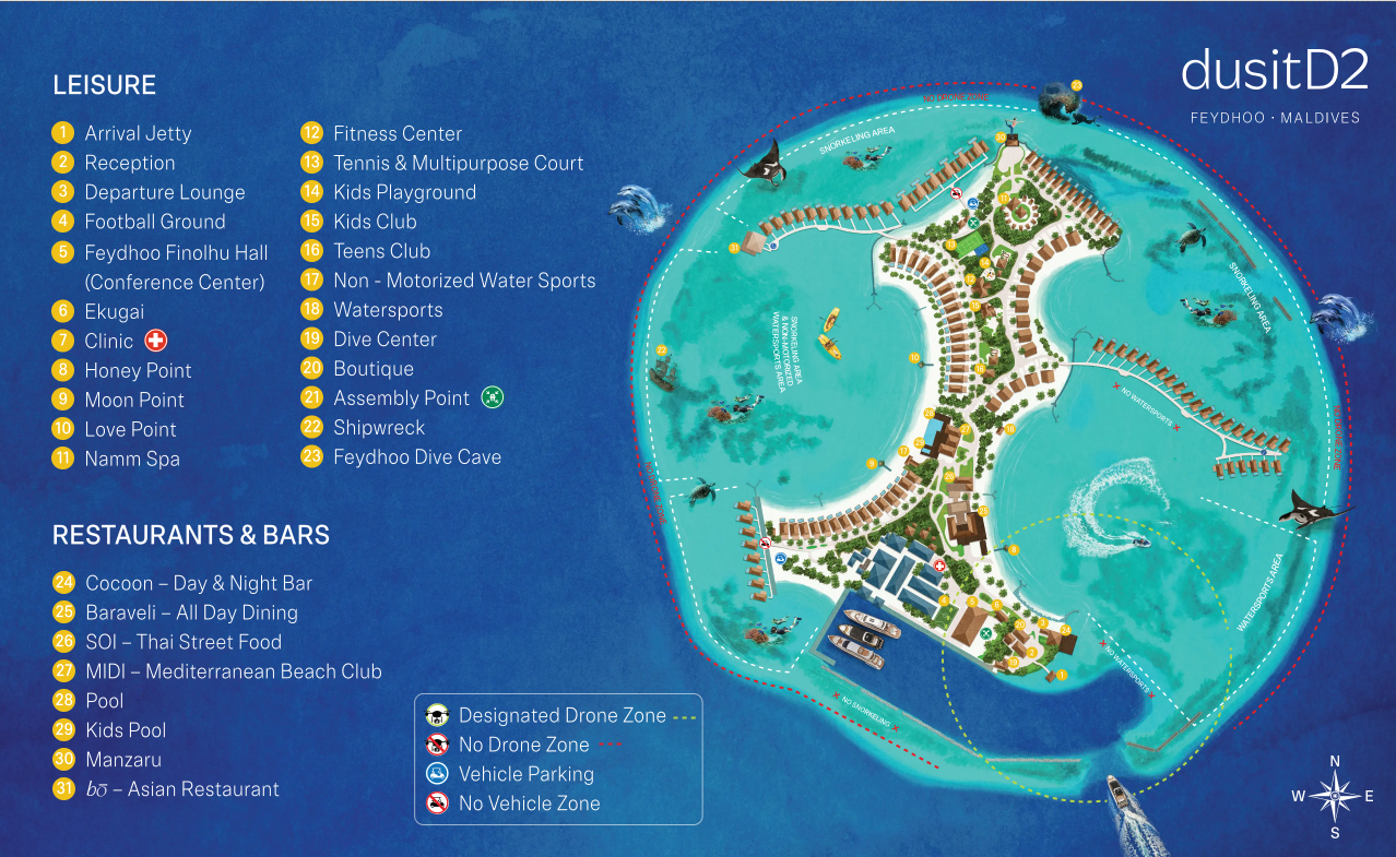 都喜费德胡岛(dusitD2 Feydhoo Maldives)计划于2025年7月2日开业。岛屿位于北马累环礁,乘快 艇7分钟即可到达,是都喜酒店集团旗下首个“全包式”度假村。岛上一共拥有127间房,包括宽敞的别墅 和家庭套房,面积从77至319 平方米不等,这家以生活方式为导向的度假村还将设有儿童俱乐部 、 5个独特的餐厅和酒吧、设施齐全的健身房、会议厅以及标志性的Namm水疗 中心,提供多种泰式按摩疗法和美容护理。这里每人每天有20美元信用额度,可用于抵消所有收费活动,包括水疗、健康计划、水上运动、潜水等。