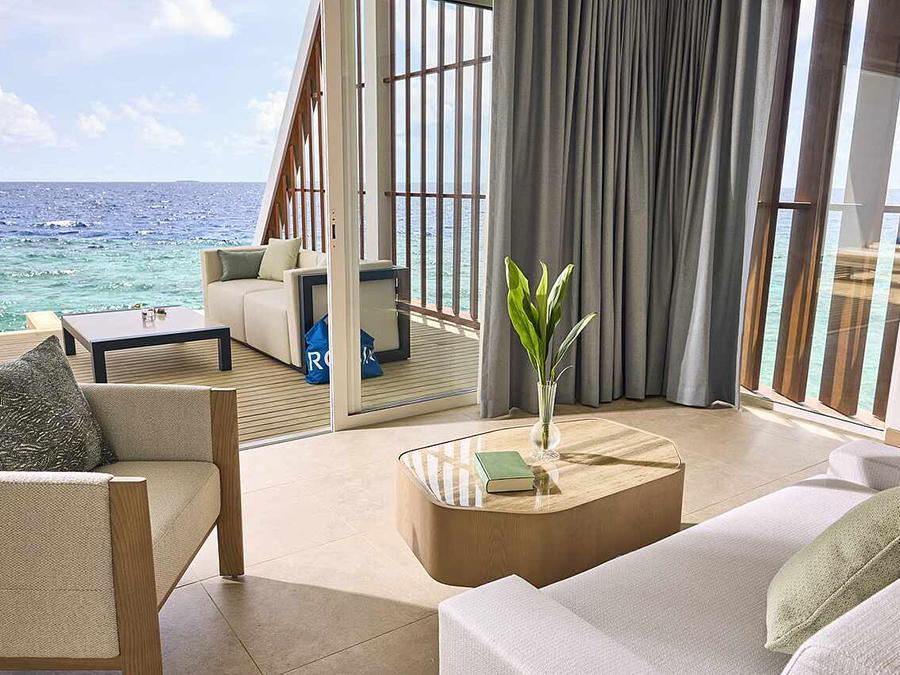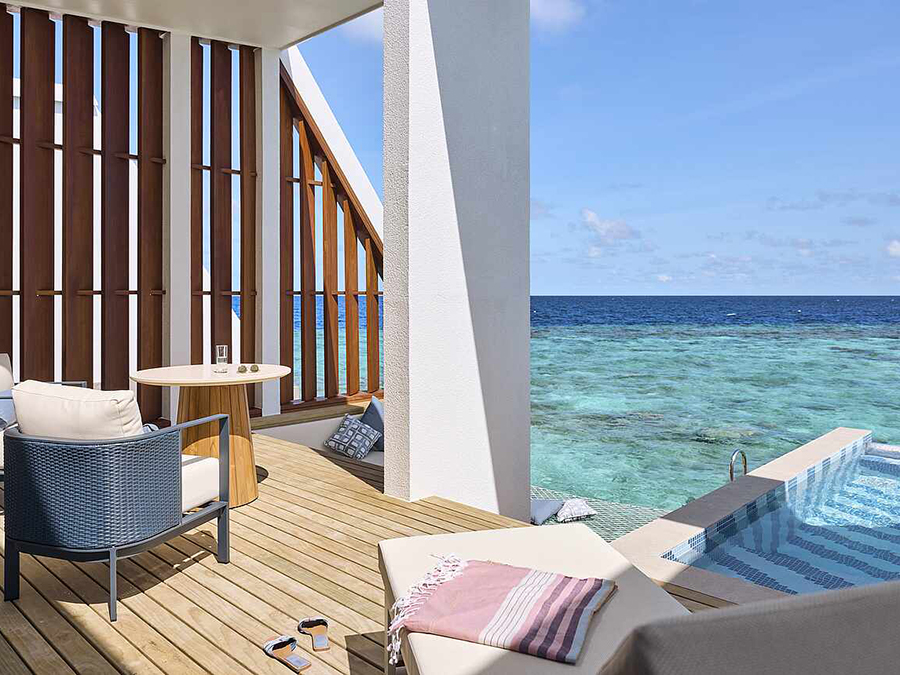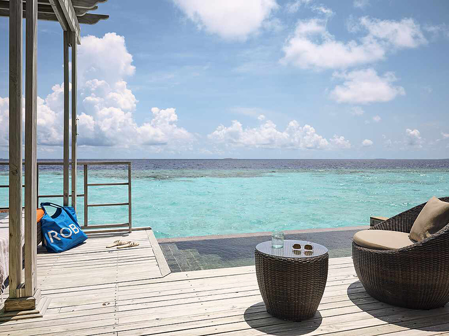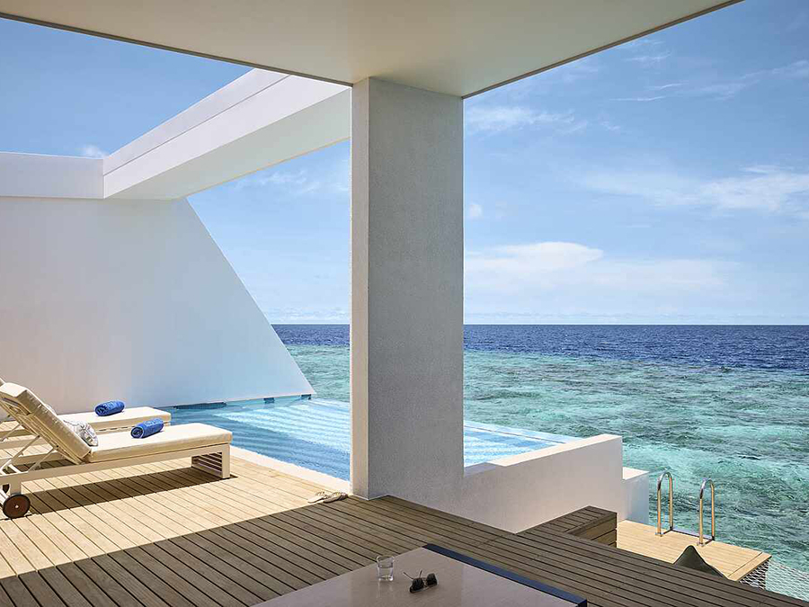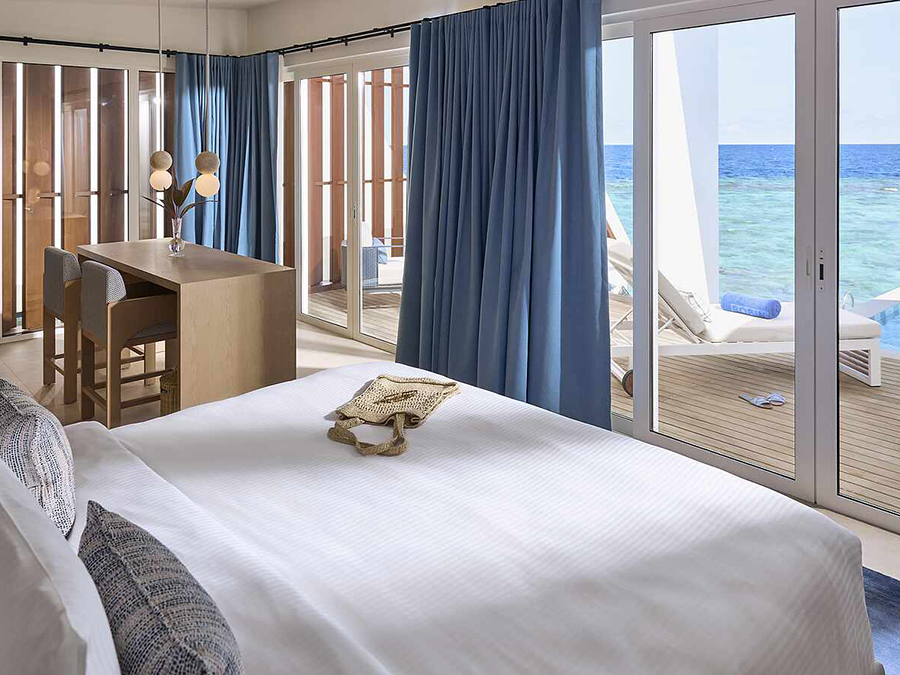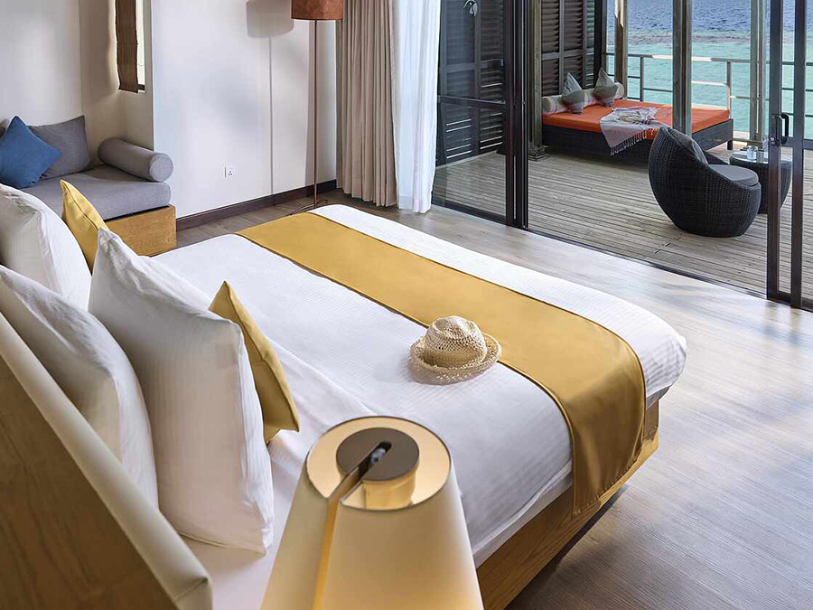 房型介绍:别墅设有露台,可直达大海,俯瞰潟湖。卧室配有特大号床,生活区设有玻璃地板,提供水下世界的视野。浴室配有2个淋浴(1个露天淋浴)户外浴室设有淋浴花洒、浴缸、卫生间、吹风机、化妆镜等。提供保险箱、冰箱、平板电视、电话和无烟区。露台配有座椅、私人泳池(约10平方米)、休闲床、漂浮在海面上的躺椅网.
