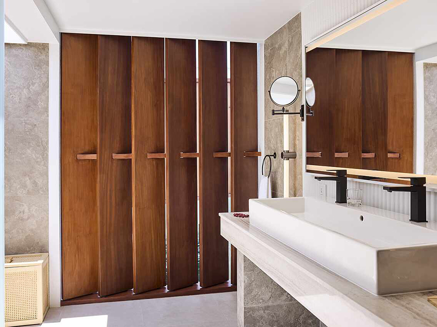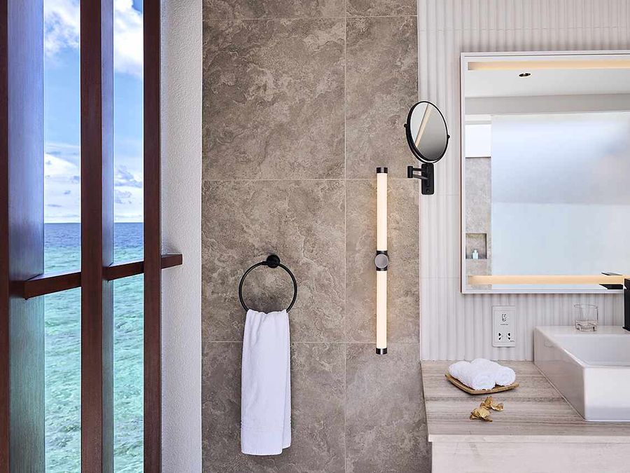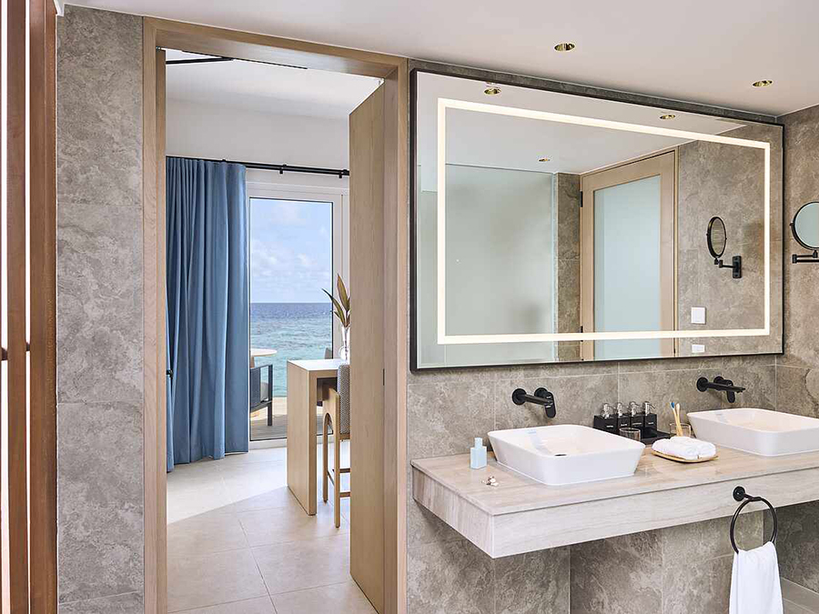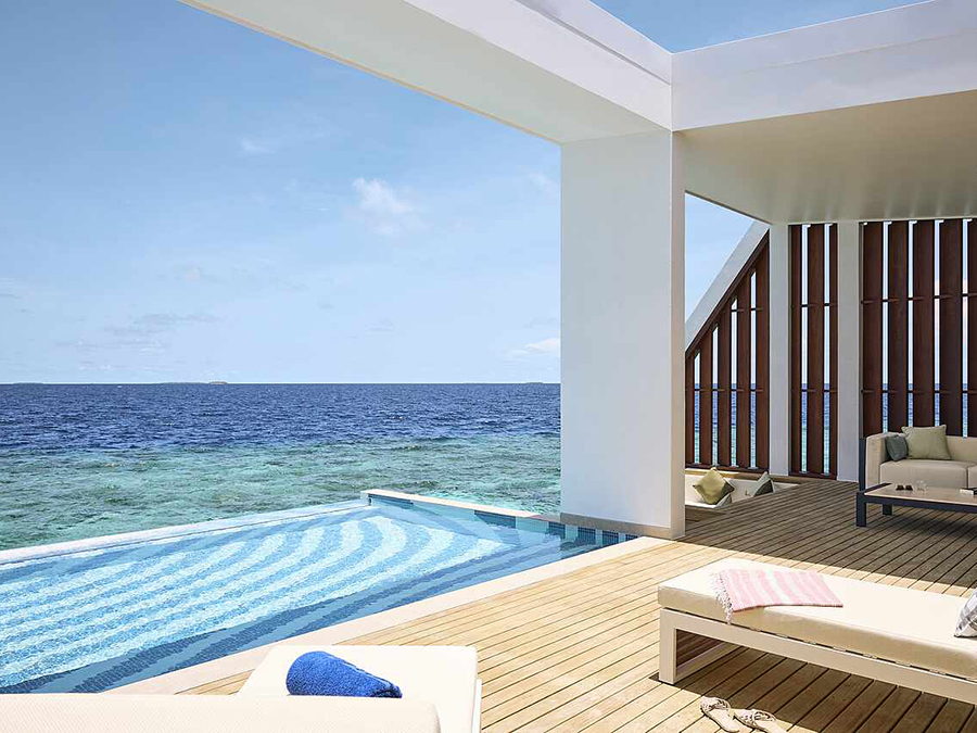 房型介绍:别墅位置绝佳,可以住4个人。浴室配有2个淋浴(1个露天淋浴)、独立卫生间、浴袍、拖鞋、吹风机、化妆镜。露台(部分覆盖):配有日光浴和休息区、带私人泳池(约24平方米)和吊床的放松区,或带日光浴和休息区、私人泳池(约24平方米)以及悬于海上的躺椅网。