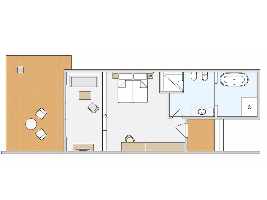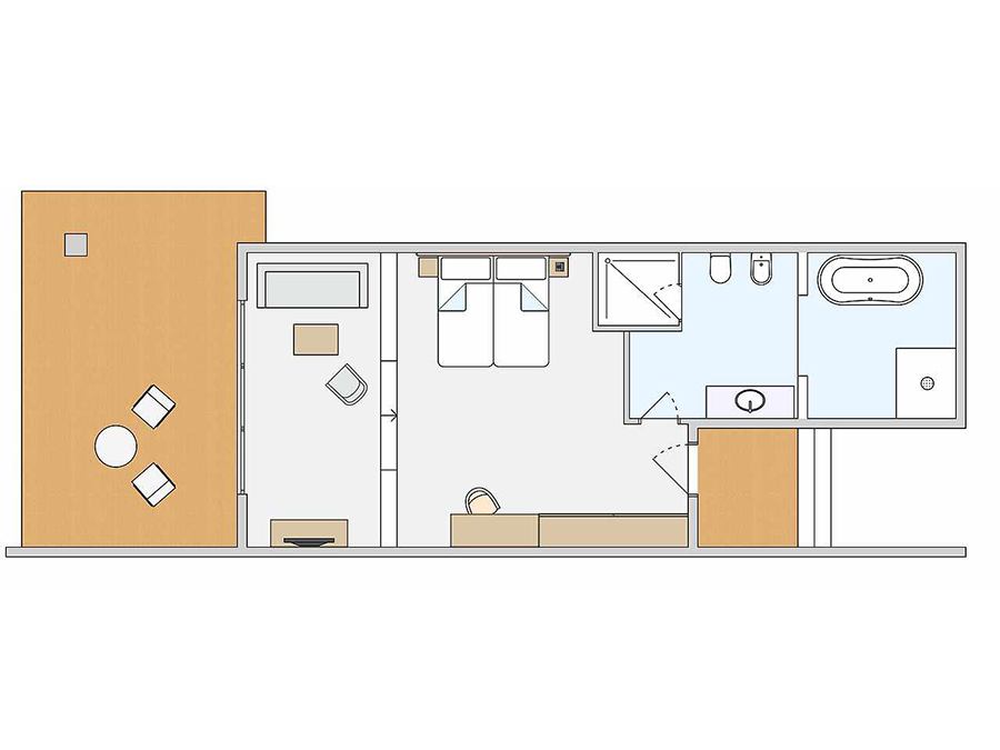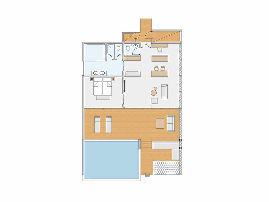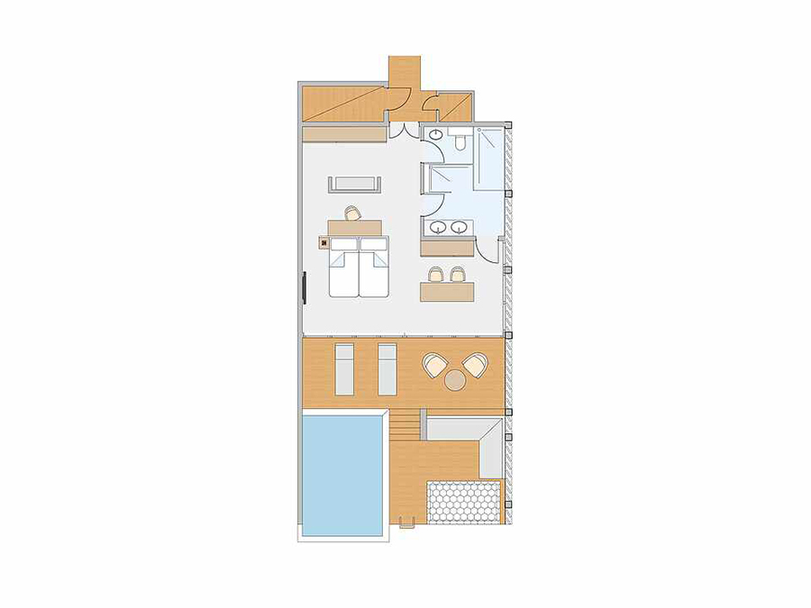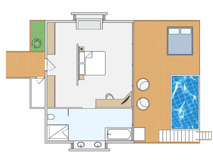 房型介绍:需要注意的是,此房型并没有对国内客户开放。卧室和客厅由2个台阶隔开,卧室配有特大号床,设有露台,户外浴室设有淋浴花洒、浴缸、卫生间、吹风机、化妆镜等。提供保险箱、冰箱、平板电视、电话和无烟区。