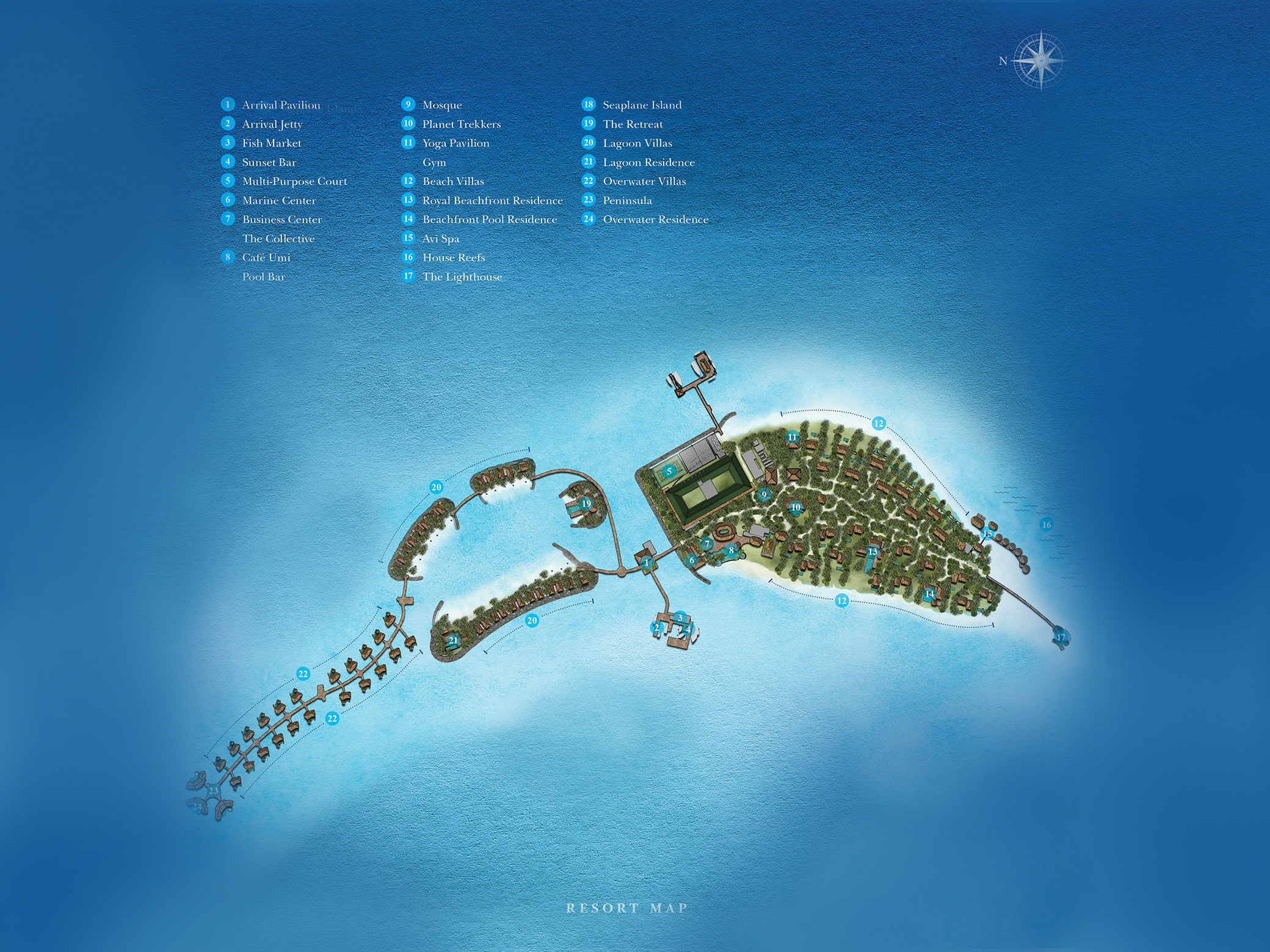 活动介绍:度假村拥有一个环绕整个岛屿的大型泻湖,是几个浮潜点的所在地,有各种各样的鱼类、黑尖礁鲨、海豚和海龟,在暗礁中潜水,当蝠鲼在环礁间迁徙时,可以和雄伟的蝠鲼一起在海中游泳,或者在清澈的蓝色海水中欣赏珊瑚的各种颜色。该度假村由远洋集团管理,还提供客人可以参加的水上运动项目列表,所有非机动水上运动项目都是免费的。热门活动有滑翔伞,喷气机,摩托艇,水上滑板,滑水,皮划艇等。