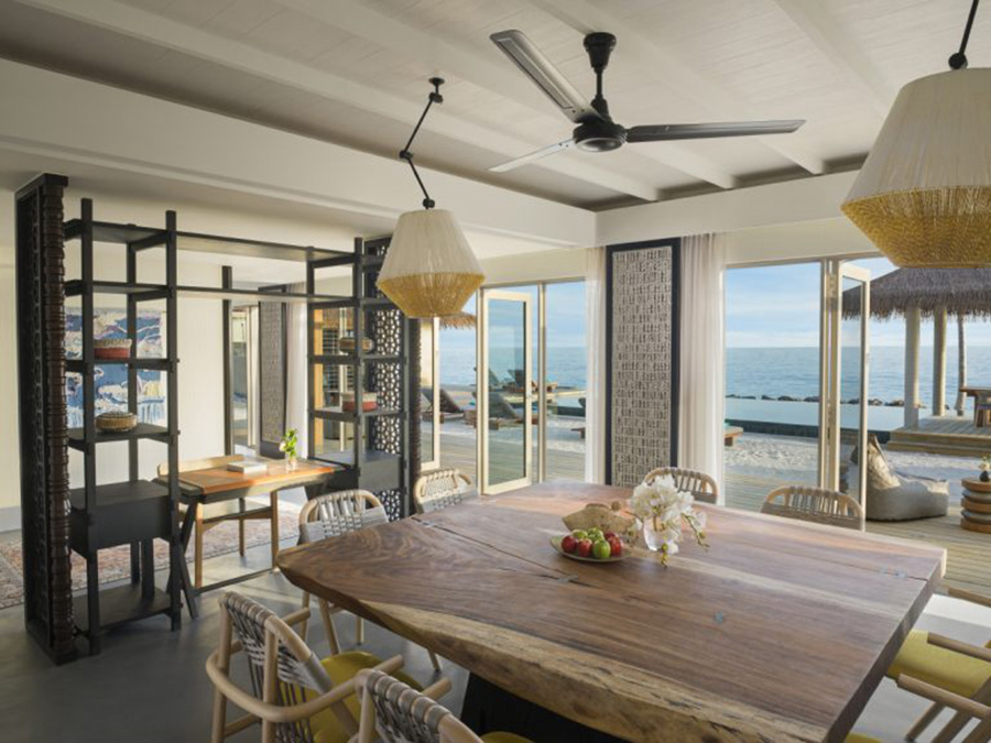 房型介绍:12岁以下儿童不能入住;最多可入住6个大人,坐落在水屋最外侧,有三间卧室,非常适合朋友结伴出行。这座别墅可以俯瞰印度洋,拥有绝佳的位置,可以欣赏日出和日落景色,你也可以在日光浴中放松,或者直接进入大海之中畅游。