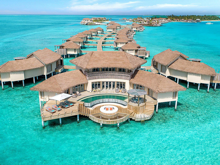 马尔代夫洲际马穆纳古酒店 360度全景游览(InterContinental Maldives Maamunagau Resort)于2019年9月正式开业,是大名鼎鼎的洲际酒店集团(IHG Hotels & Resorts)旗下最高端的酒店之一。洲际酒店在全球100多个国家有着超过4400家酒店,这是它在马尔代夫新建的第一家酒店。酒店位于拉环礁(Raa Atoll)世界生物圈保护区内,抵达马累后可以有两种上岛方式,乘坐35分钟水飞,或者20分钟内飞加35分钟快艇。岛上提供中文服务,不必担心语言问题,房型的选择也很多,有14种房型可供选择,内部装饰很是奢华,私人泳池也是标配,房间的面积都比较大,从100㎡到790㎡。另外,洲际酒店的美食,肯定是九宫格容纳不下的,酒店总共有6间餐厅,除主餐厅以外,还可以在岛上的标志性建筑“特色塔楼”(地中海餐厅)享用浪漫晚餐。