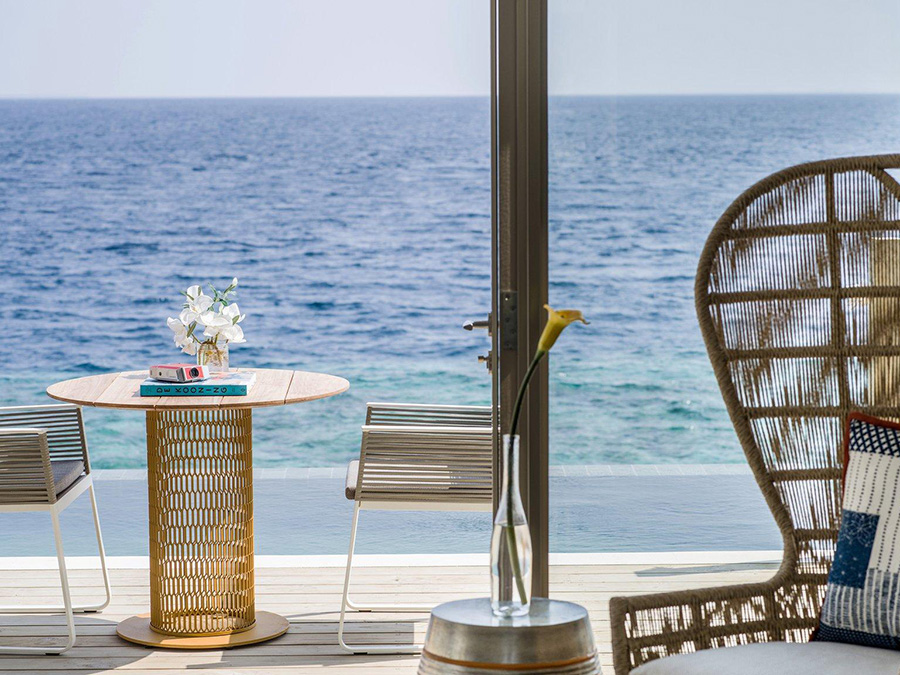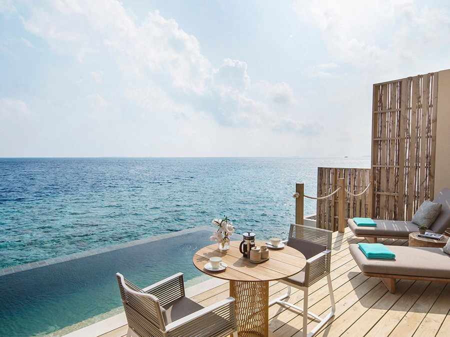 房型介绍:12岁以下儿童不能入住;别墅位于大海之中,是真正的水上别墅,有绝美的海景,面向西面,拥有日落美景。你的床、浴缸或私人游泳池都是全海景房,对印度洋一览无余。房间设有一张大床、开放式浴室、私人无边泳池,两侧还有软垫日光床和露天餐厅。