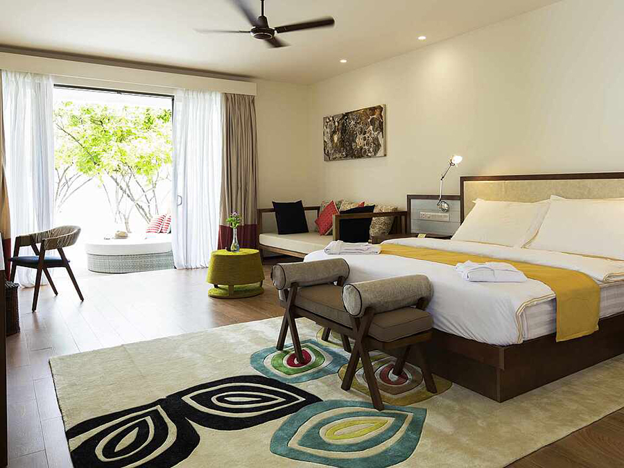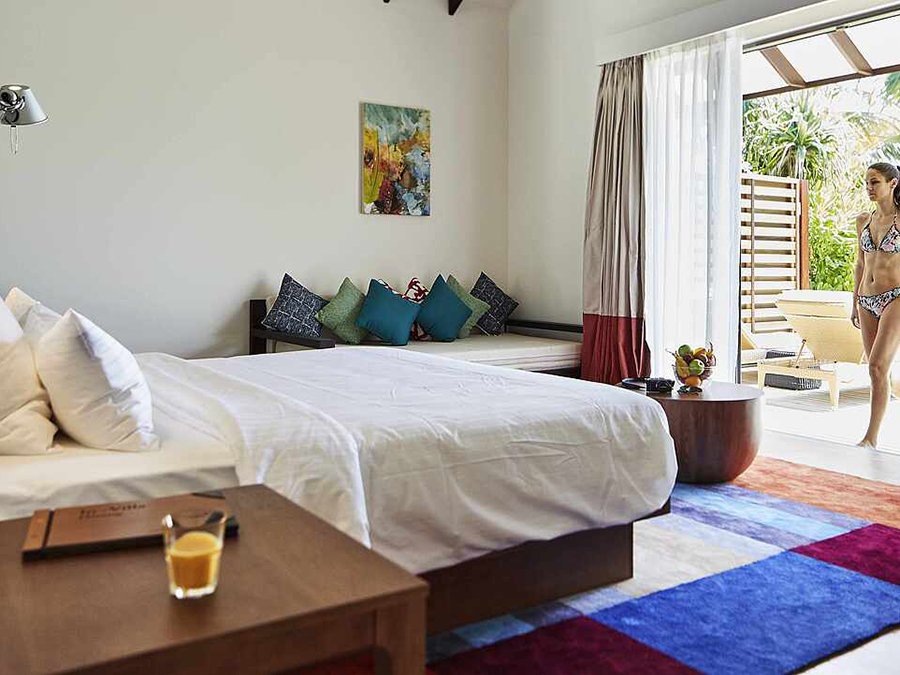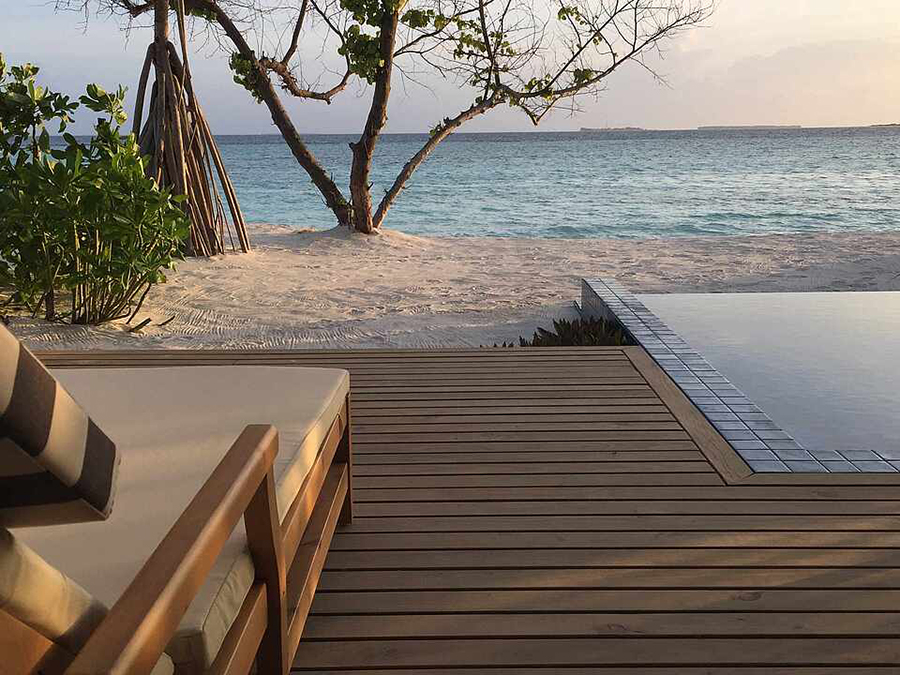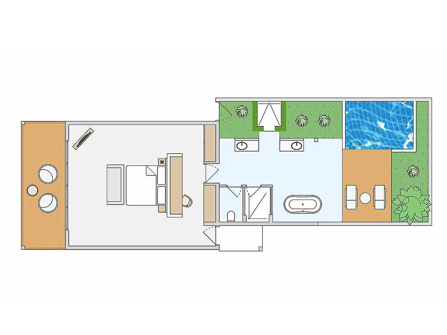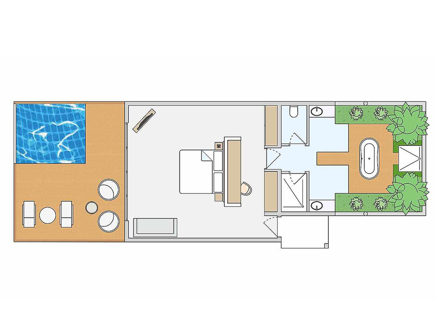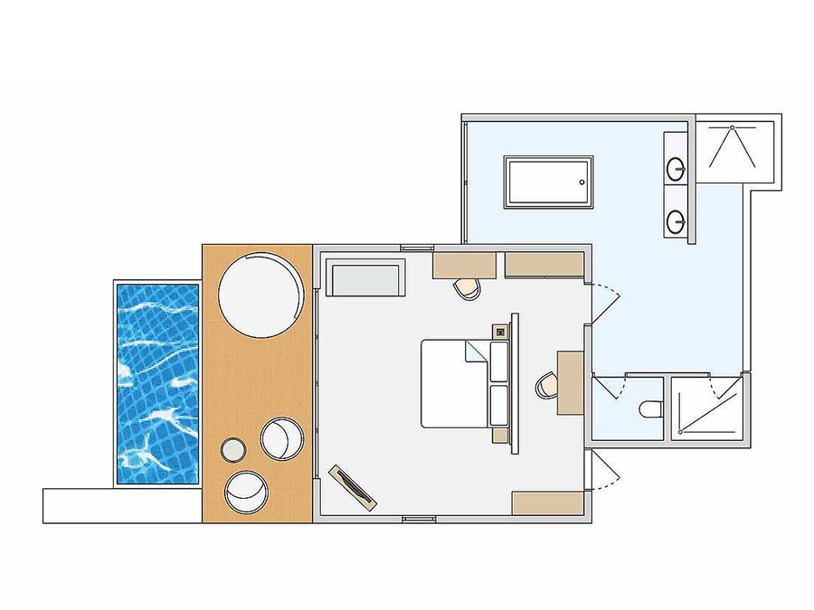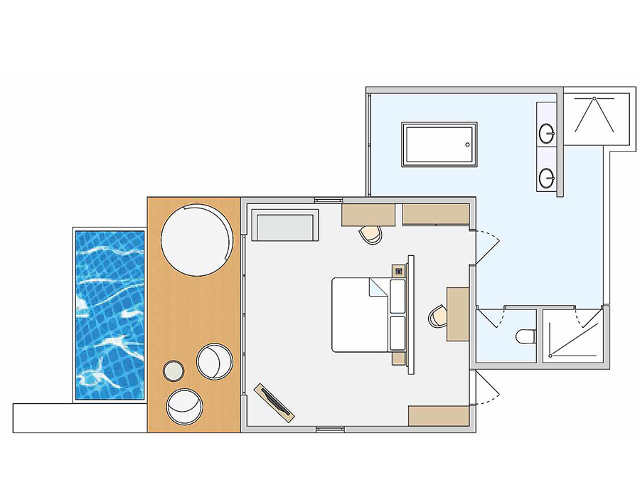 房型介绍:泳池沙滩房的泳池位于房间甲板外的沙滩上,靠近海边,可欣赏海景。面向海滩的露台,配有日光浴床、座位和私人泳池(尺寸:260x330厘米,深度:120厘米)。第三人的住宿形式为沙发床(尺寸:0.90米×2米);第四人的住宿形式为折叠床,在最大容纳内,可提供婴儿床,预定时需说明。